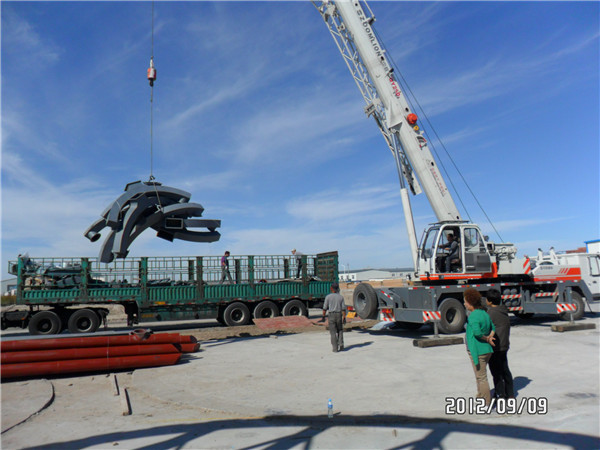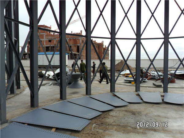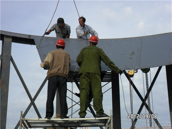 安裝時,根據倉徑的大小,采用多個吊裝架,吊裝架上固定一個手動葫蘆,使用特制的吊板用螺栓固定在倉壁墻板上,緩緩提升倉體。采取自上而下的安裝方式,即先安裝頂蓋、上層墻板,然后在裝中層墻板,再裝下層墻板,后將整個倉固定在基礎上。筒倉的構件全部采用高強度螺栓連接,安裝方便、迅速、可靠。