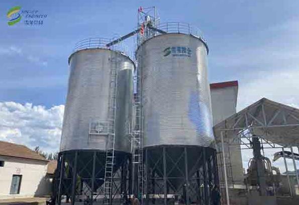 此項目為2臺250T全鋼錐底鋼板倉,項目工作流程為糧食經卸糧坑進到提升機,提升機配合電動三通的開合經流管將糧食輸送到不同的鋼板倉中,錐底鋼板倉配合倉底閘門的開合通過D2或D3刮板機輸送到車間。
