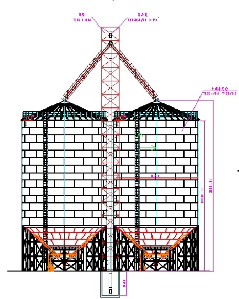 提升機(jī)塔架總高36M,提升機(jī)卸糧坑下潛3.7M, 提升機(jī)凈高39M;兩座倉(cāng)體大小一致,鋼板倉(cāng)直徑為11m,錐形倉(cāng)頂高: 25.37m ,總高 25.8m, 倉(cāng)頂角 25°,鋼板倉(cāng)倉(cāng)頂蓋板為δ1.0mm熱鍍鋅板,選用國(guó)產(chǎn)優(yōu)質(zhì)熱鍍鋅板,倉(cāng)頂上設(shè)置自然通風(fēng)窗、人孔、爬梯,倉(cāng)頂用航空膠泥和防水墊圈密封,沿倉(cāng)檐四周設(shè)有安全防護(hù)。